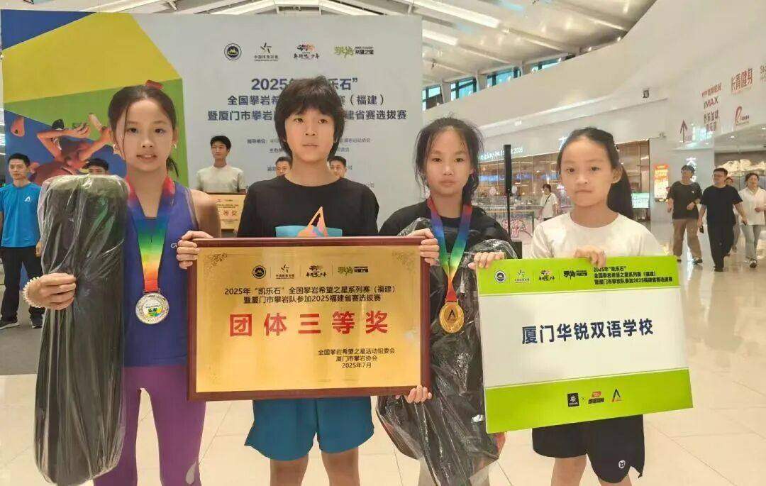 这些成绩背后,是学校对攀岩运动的系统性投入与阶梯化培养。华锐配备了专业的室内攀岩馆,是厦门市较早将攀岩纳入体育课程的学校之一。学校还组建了一支14人的攀岩校队,由专业的全职攀岩教练带队训练。