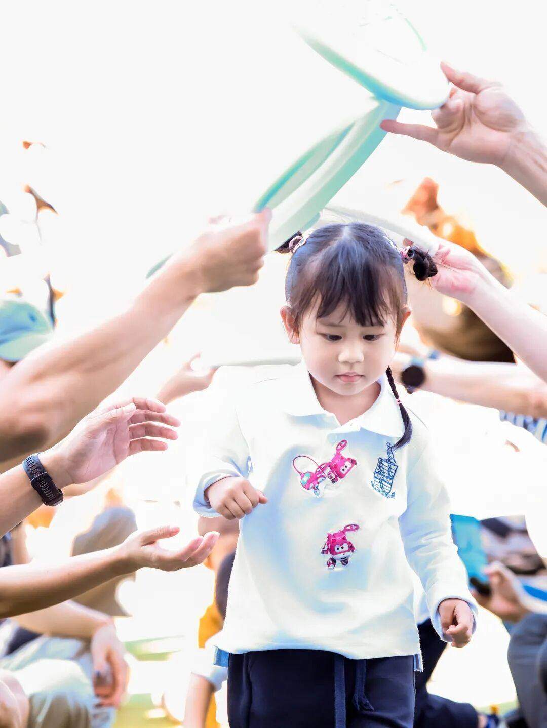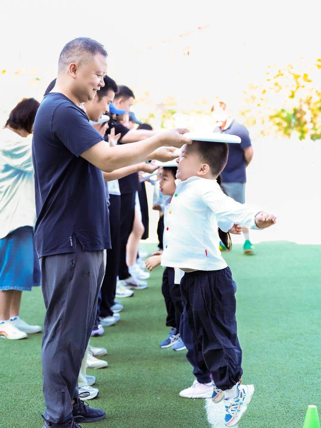 家长们高高举起盾牌,像守护小英雄一样护住孩子,看着宝贝们钻过盾牌隧道、跳过障碍物、张开双手像“飞机”一样穿梭,偶尔没站稳时,家长立刻伸手扶稳,相视一笑的瞬间满是温情。