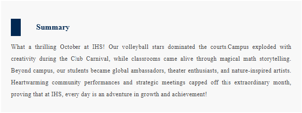 秋意渐浓,丹桂飘香。过去的十月,对我们IHS 高中部的师生而言,是一个充满活力、收获与温暖的丰收季。从运动场的奋力拼搏,到社团活动的创意迸发;从社区服务的爱心传递,到学术领域的深入探索……每一个瞬间都闪耀着青春的光芒。现在,就让我们一起回顾这精彩的十月大事记!