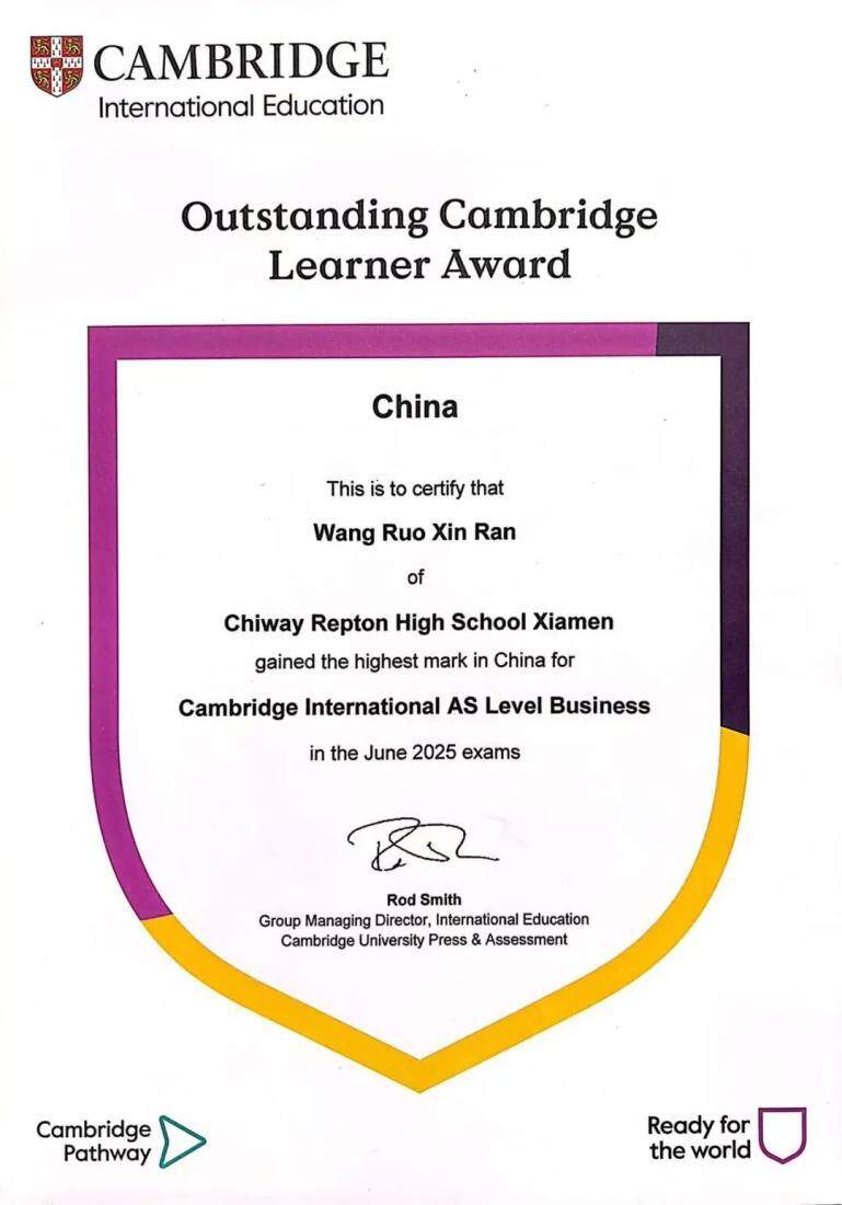 本年度,全国仅有57人次获此殊荣,竞争极为激烈。华锐IHS高中部学子Eva Wang同学在AS商学(AS Level Business)学科中表现卓越,斩获代表中国区单科最高标准的“中国顶尖奖(Top in China)”,并成为福建省该奖项的唯一获得者。