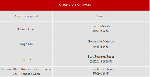 在刚刚落幕的 MUNOX 2025 模拟联合国大会上,IHS高中13名参会代表凭借出色的综合实力斩获多项重磅荣誉,展现了卓越的国际视野与外交素养。