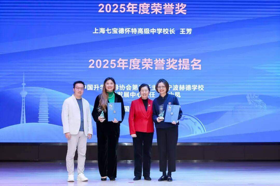 上海七宝德怀特高级中学校长王芳获得荣誉奖,中国升学指导协会第二任主席/宁波赫德学校未来发展中心主任成小凤、苏州外国语学校高中国际部获荣誉奖提名奖;