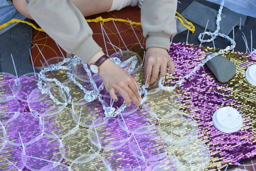 “塑料是一种奇妙的材料:它能很好地保存食物,用途广泛,价格低廉。然而,它也像‘魔鬼’一般,极难降解。”Mariëlle女士说。在创作过程中,学子们触摸到了这种材料的双重性,也在“褶皱”当中,产生了新的认知。创作刚开始时,郑语诺就犯了难,“废品好像和艺术毫不相干,让人无从下手”。但是,在装饰龙腿的过程中,她感受到:“塑料从来不是用后即弃的终点”。
